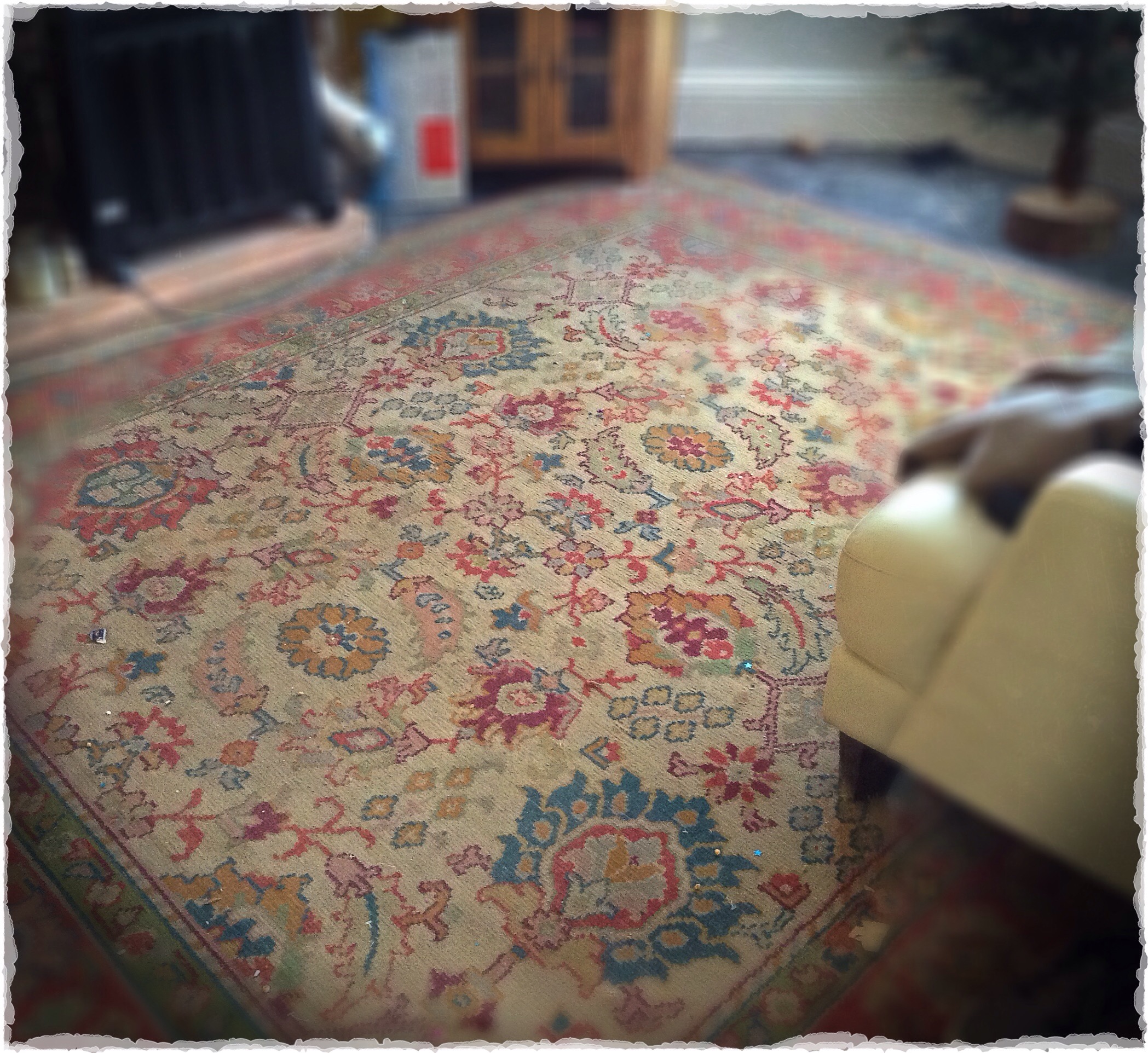 It’s in surprisingly good condition with quite vibrant colours remaining, I know nothing at all about carpets or rugs, I’m guessing it might be 1920s as it’s slightly larger than the shadow of an earlier Victorian rug.