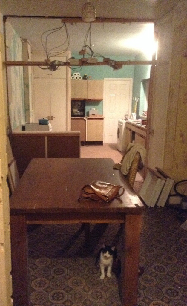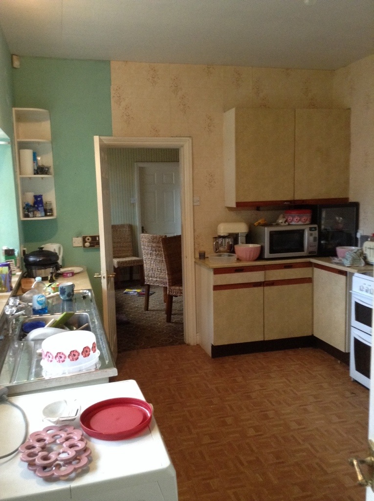 The kitchen spans the original part of the house with the later extension. We’ve knocked through the kitchen (new extension), breakfast room (original kitchen) and the little foyer which was probably the old back door, though interestingly, our neighbours told us there was originally a beautiful stained glass door there, there’s also an ornately tiled floor (sadly under concrete in our case) which seems at odds with a ‘tradesmen’ entrance.